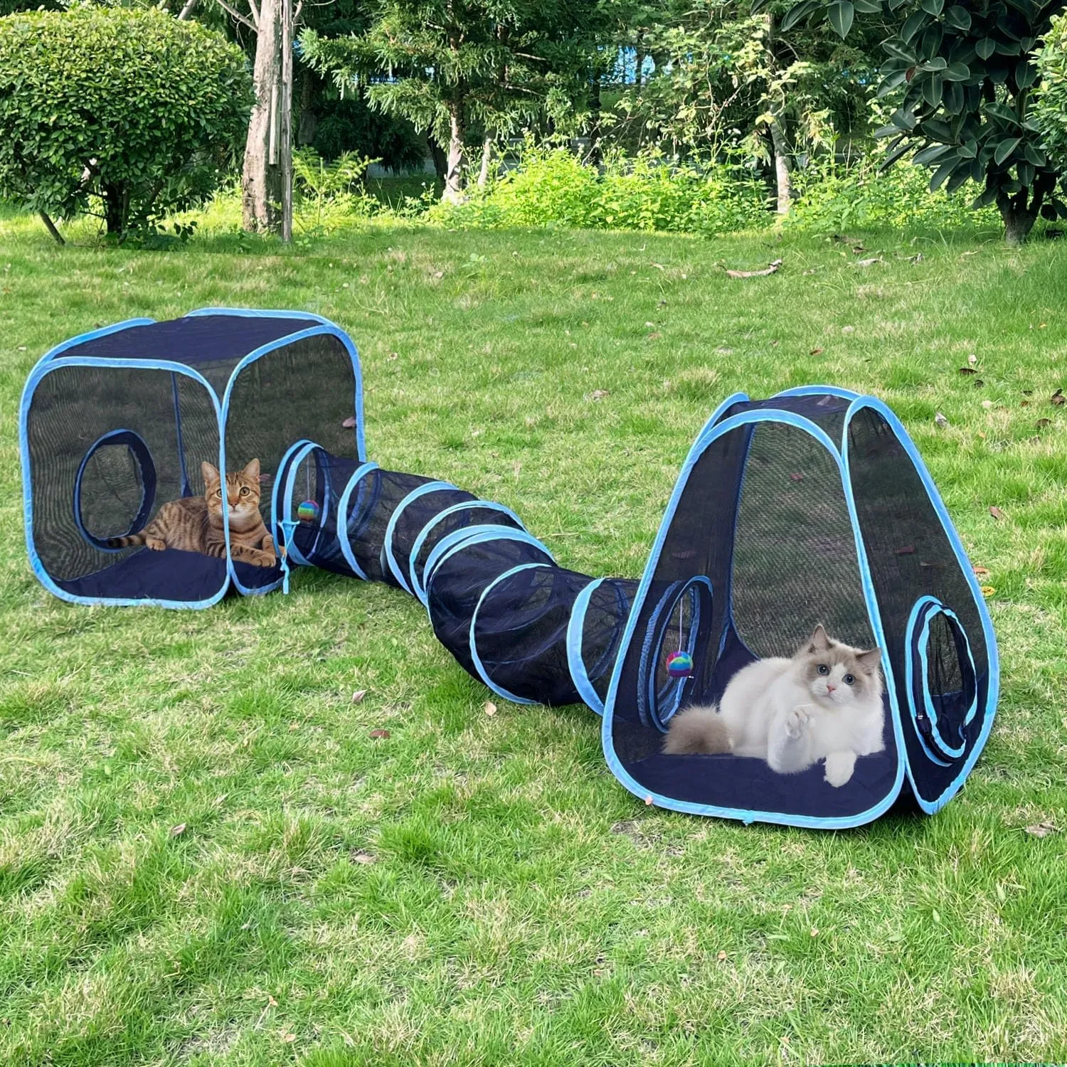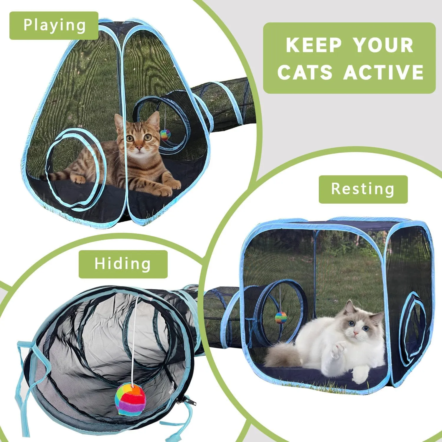 【Flexible Combinations】The outdoor cat enclosures includes tent, cube and tunnel, The cat tunnel can link to cat tent by zipper for cats to play. Cat cube and cat tunnel can be used together or separately. Hanging balls and bells are placed at the exits, providing interactive entertainment and encouraging daily exercise to keep your pet active.